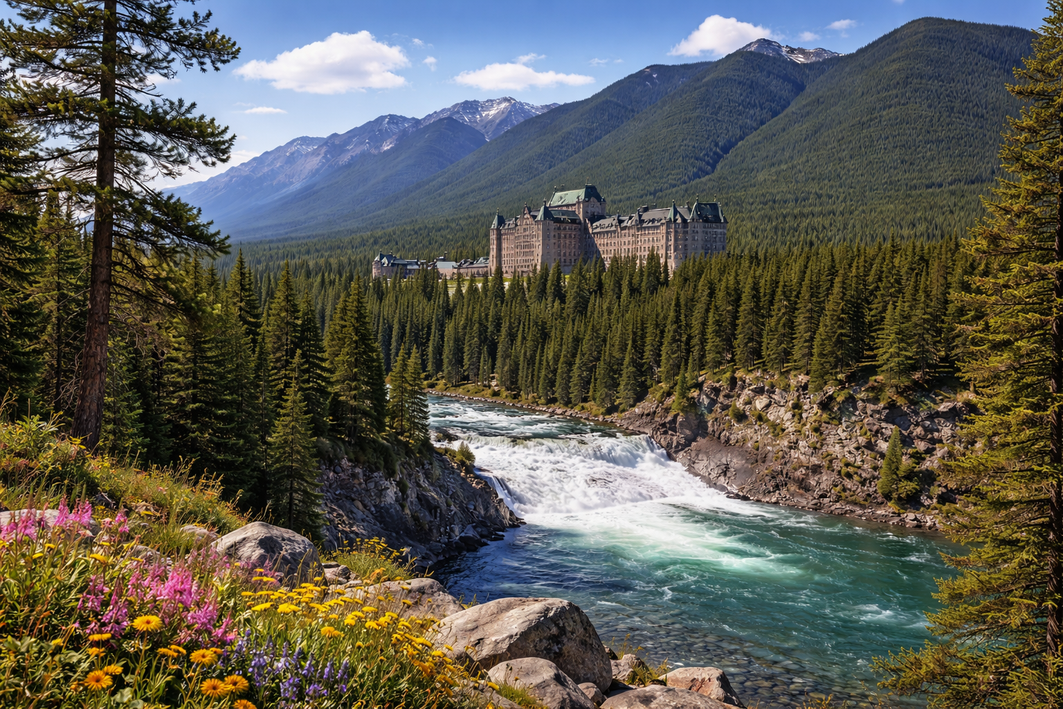 A scenic viewpoint overlooking the iconic Fairmont Banff Springs Hotel with sweeping views of the Bow River valley.