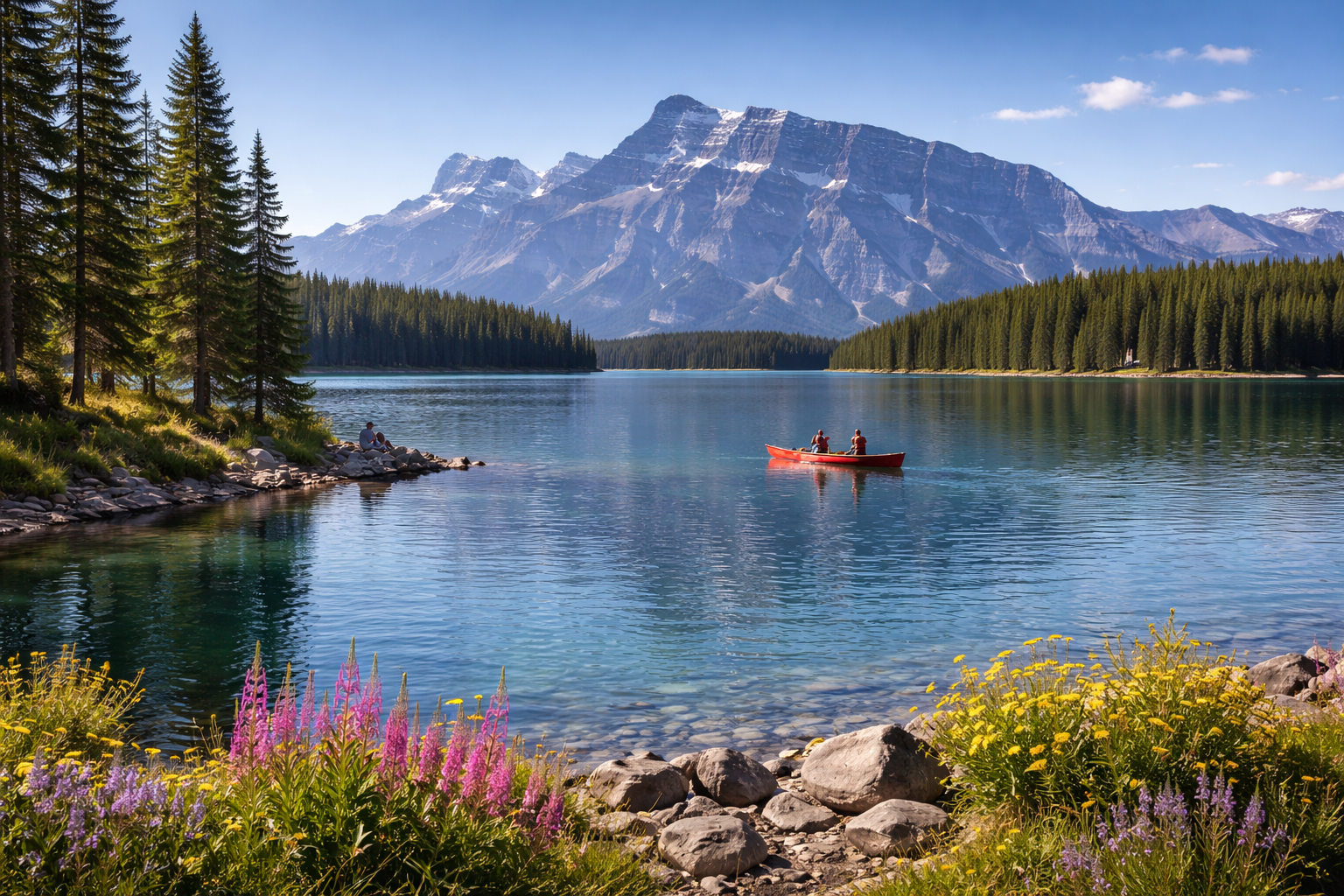 A peaceful and picturesque lake offering beautiful reflections of Mount Rundle - perfect for photos and short stops.